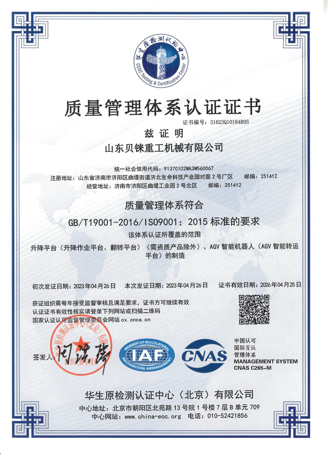• 質量體系認證書